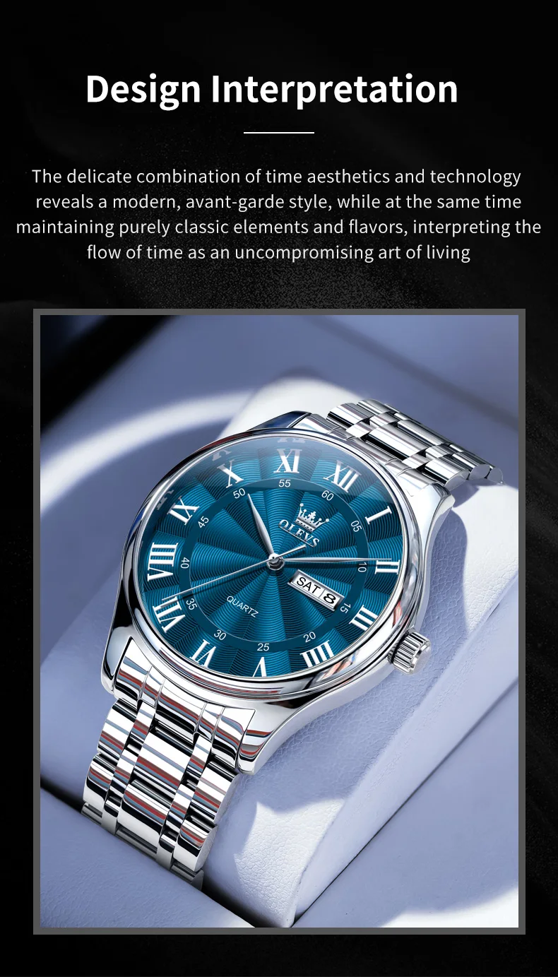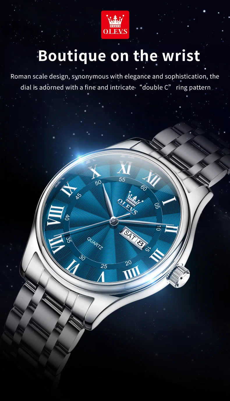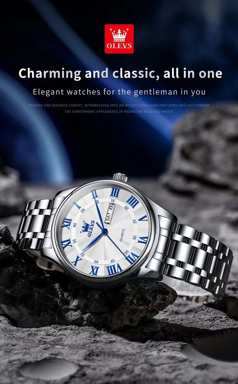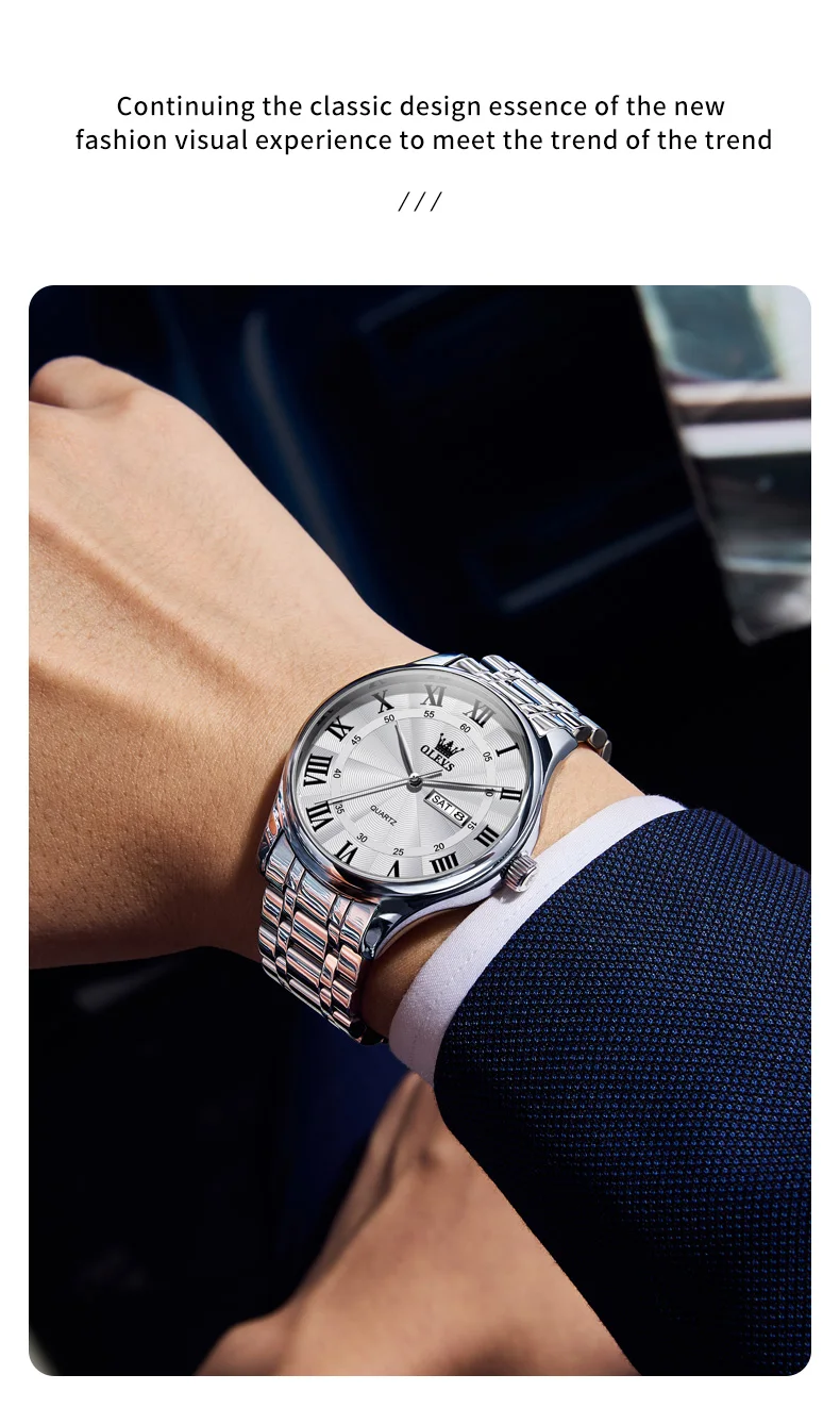 OLEVS 3663 Watch Mens Business Original Quartz Waterproof Luminous Hands Mens Chronograph Roman Numeral Dial Stainless Watches
