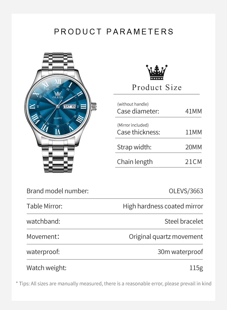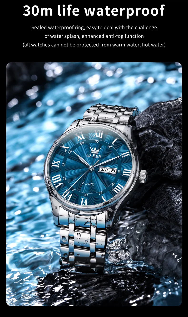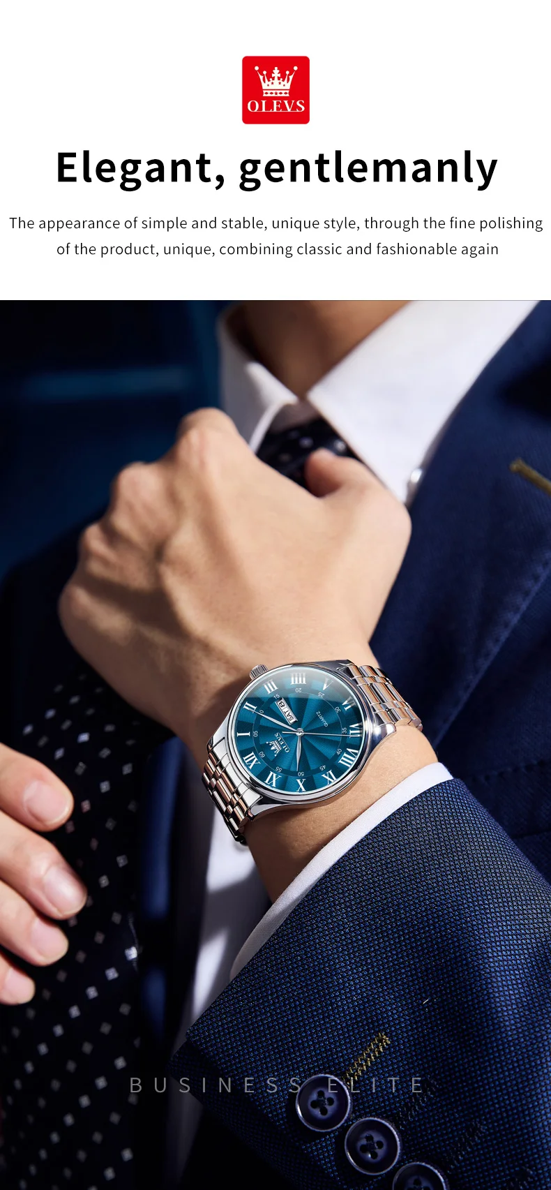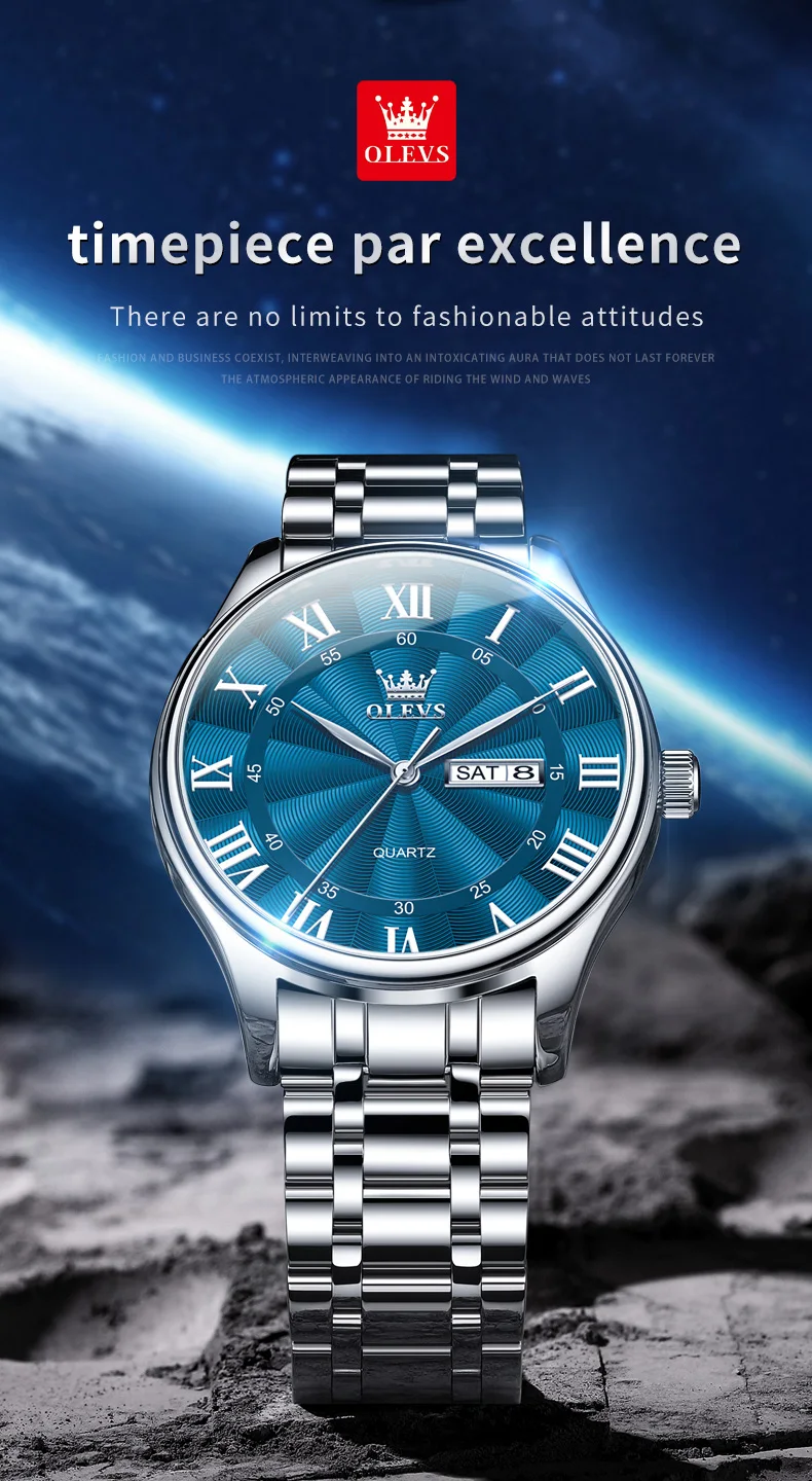 OLEVS 3663 Watch Mens Business Original Quartz Waterproof Luminous Hands Mens Chronograph Roman Numeral Dial Stainless Watches